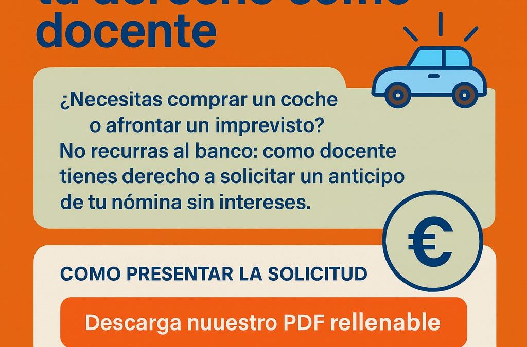 «¿Necesitas comprar un coche o afrontar un gasto imprevisto? No recurras al banco: como docente tienes derecho a solicitar un anticipo de tu nómina sin intereses.»