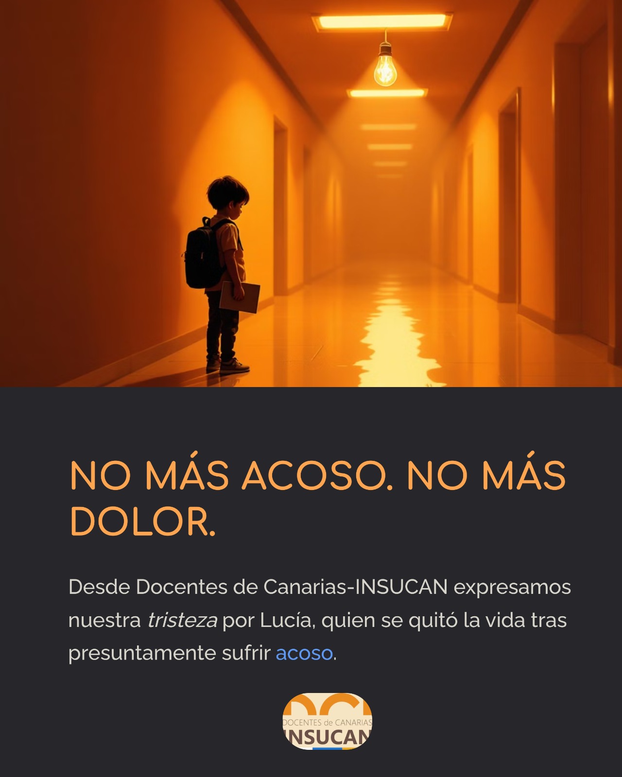 Desde Docentes de Canarias-INSUCAN queremos mostrar nuestra más honda tristeza e impotencia por el fallecimiento de Lucía, la niña que se quitó la vida supuestamente después de denunciar acoso continuado. Mostramos nuestra solidaridad y cariño con sus padres y con la asociación “Visión Azul Autismo”, por estar cerca de la familia en momentos tan difíciles.